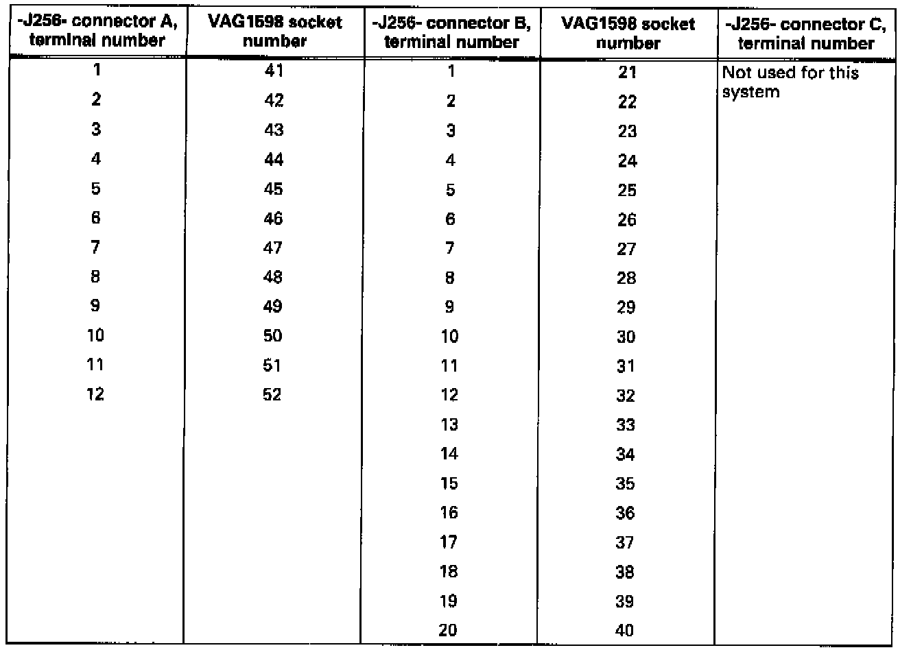 - The terminal numbering of convertible top control module connectors A and B does not correspond to the socket numbering on the VAG 1598 test box when using the VAG1598/11 adapter.- Terminal numbering of convertible top control module connector D is identical to socket numbering on VAG1598 test box when using VAG1598/12 adapter.