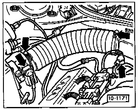- Loosen clamps at points shown (upper arrows) and remove air hose between Mass Air Flow (MAF) sensor and intake manifold.