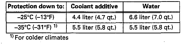 - Anti-freeze and coolant additives marked "In accordance with TLVW774A" prevent freezing, corrosion damage, scale formation and raises the coolant's boiling point.- The high boiling point of the coolant mixture helps improve engine efficiency when operating at full load, particularly in tropical climates.