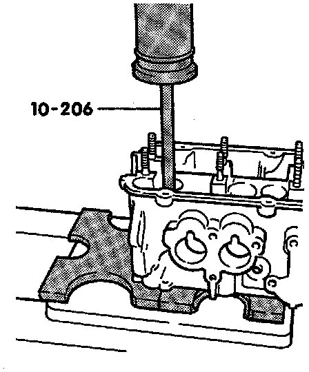 - Coat new guides with oil and, using drift 10-206, press new guide into cold cylinder head from camshaft side until shoulder makes contact.
