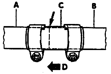 - Place center muffler outlet pipe -A- and rear muffler inlet pipe -B- into double clamp -C- up to stop (arrow).