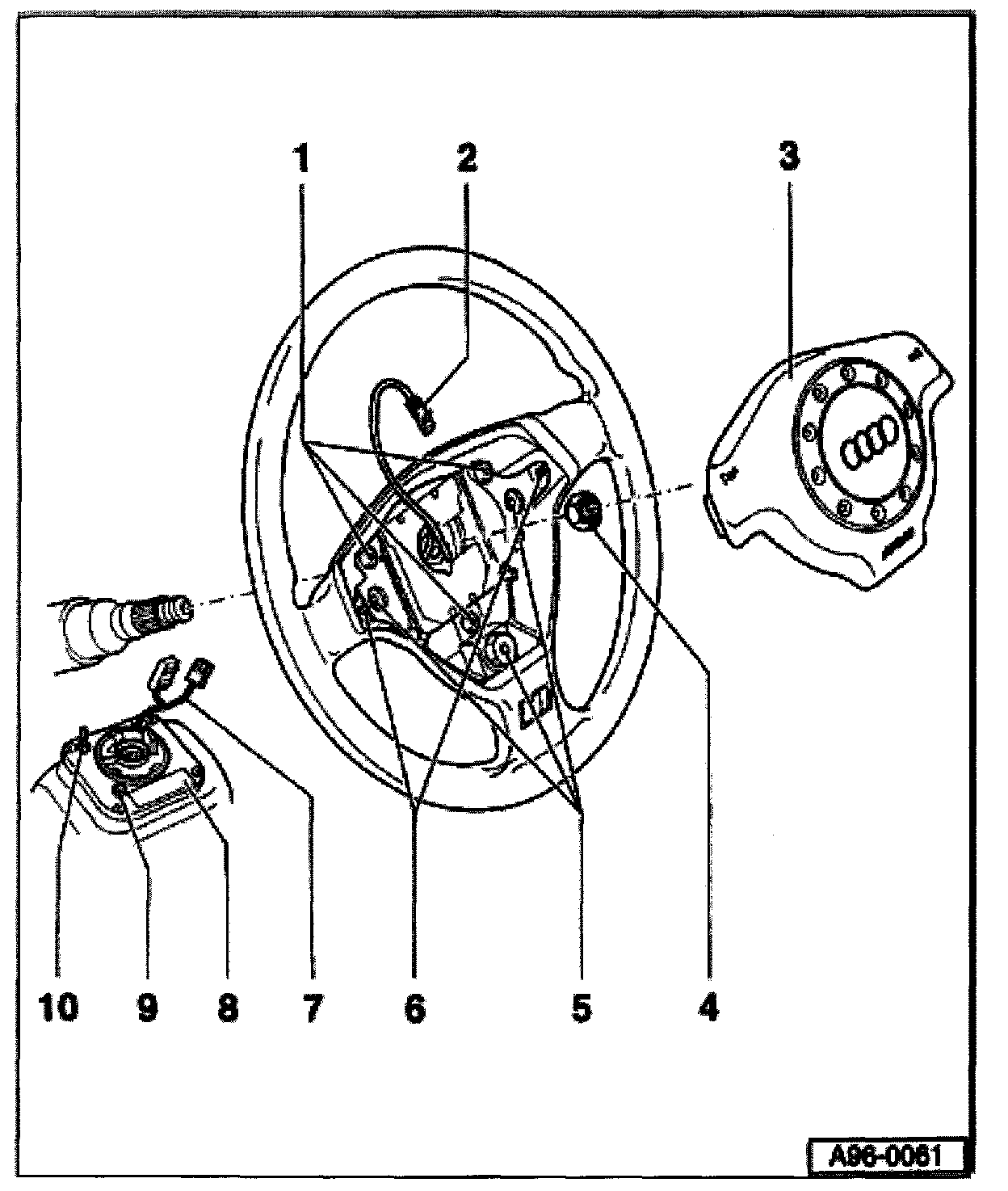 - Remove airbag unit for steering wheel; disconnect airbag spiral spring harness connector -7-.