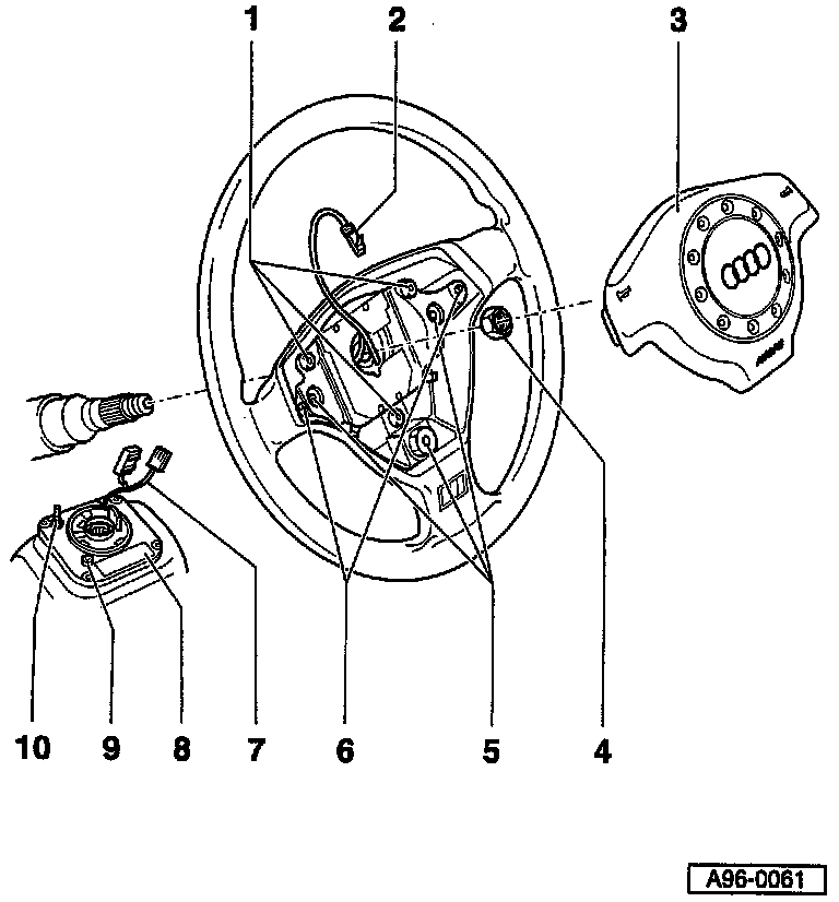 ^ Airbags and related equipment (e.g. steering wheel) must only be disassembled, assembled and repaired by trained Audi Service Department personnel.