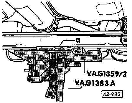 - Carefully raise rear axle using VAG1383A transmission jack and loosely install both mounting bolts in bearing mounts.