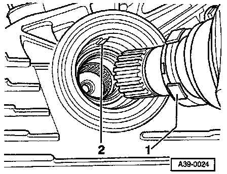 NOTE: The lugs (2 in illustration) of the drive gear (vehicle speed sensor) must be engaged between the clips on the support ring (1 in illustration).