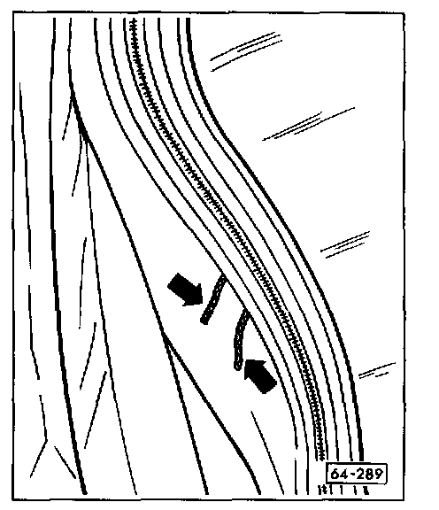 - Insert inside part of rear window installation tool between convertible top fabric and rear cross bar (arrow) on both sides.