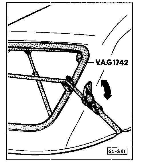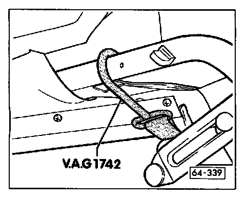 - Hook tensioning belt hooks from VAG1742 on both sides of convertible top frame.