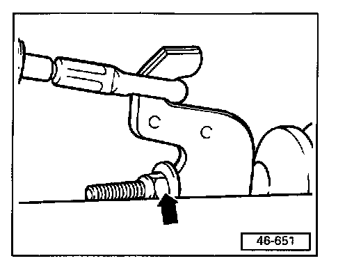 - Loosen parking brake cable adjusting nut until both levers lie on stop.