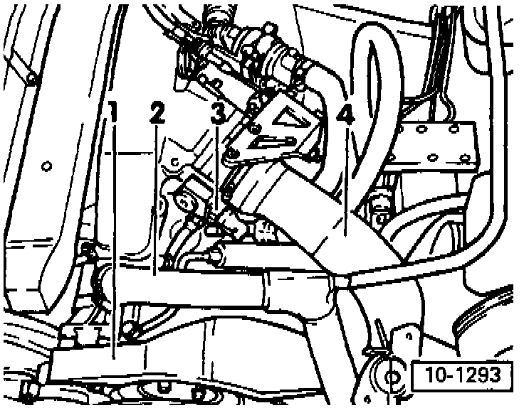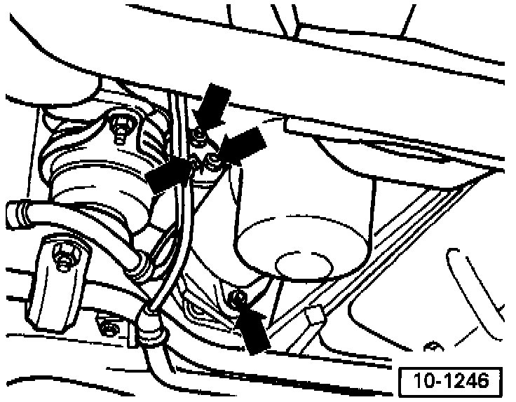 - Remove cross-member with torque arm. To do this, remove pressure reservoir bracket from left longitudinal member and torque arm from engine. Unscrew four bolts (arrows) and remove cross-member.