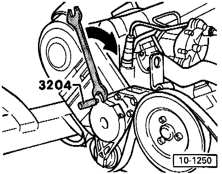 - Relieve tension on poly-ribbed belt by turning tensioner in direction shown (arrow) with open-end wrench and insert pin 3204 into hole.