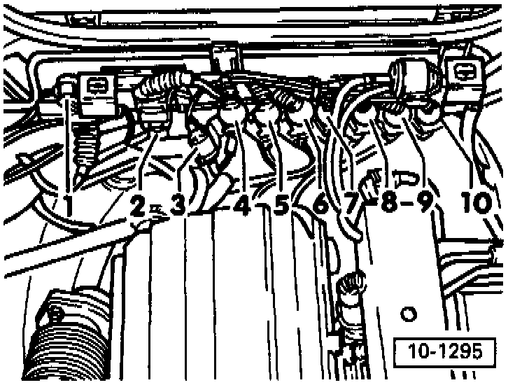 - Disconnect upper hose to radiator (2) at radiator and coolant manifold and put aside. T-shaped hose to expansion tank remains connected.