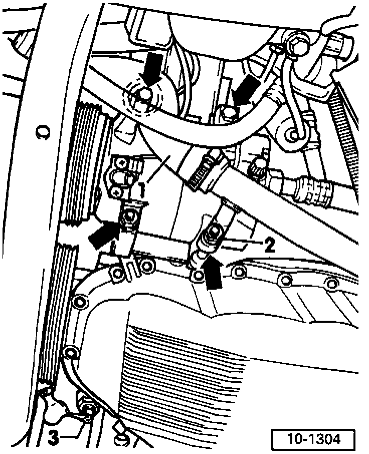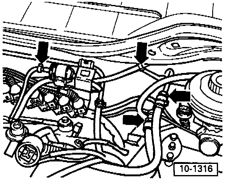 - Remove retaining clip for refrigerant and coolant line ref. arrow, (vehicles with A/C)