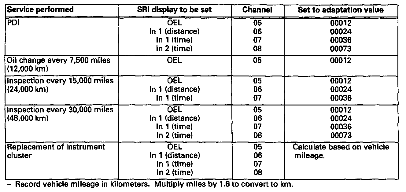 The instrument cluster is coded according to the engine and country variants as well as individual, scheduled service intervals. The instrument cluster must be coded initially at the Secondary PDI (or time of delivery) and whenever a replacement cluster is installed. In addition, SRI displays must be reset after each specified service or inspection is performed.