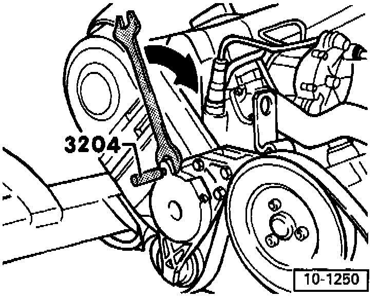 - Relieve tension on ribbed belt by swinging tensioner in direction shown (arrow) and inserting pin 3204 into holes.