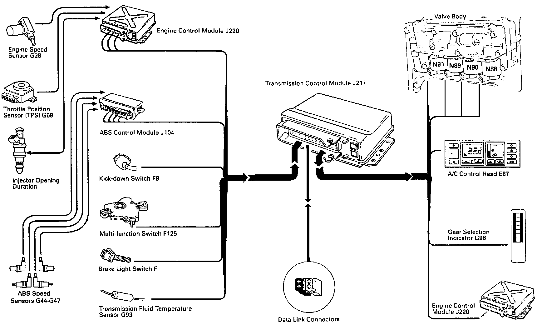 The TCM's self diagnostics can be accessed using the V.A.G 1551 Scan Tool or a generic scan tool via Rapid Data Transfer. Not all functions of the self diagnostics are availible using a generic scan tool. Data cannot be transferred via Blink Code Output because the "L" data wire has been eliminated.