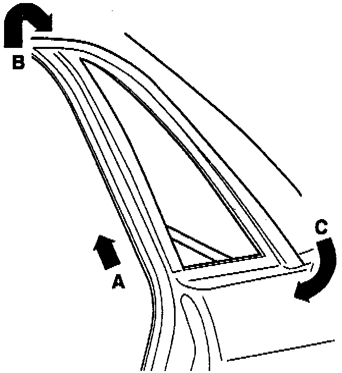 - Pull cutting wire down along D-pillar between PVC coating and roof molding (arrow -B-).