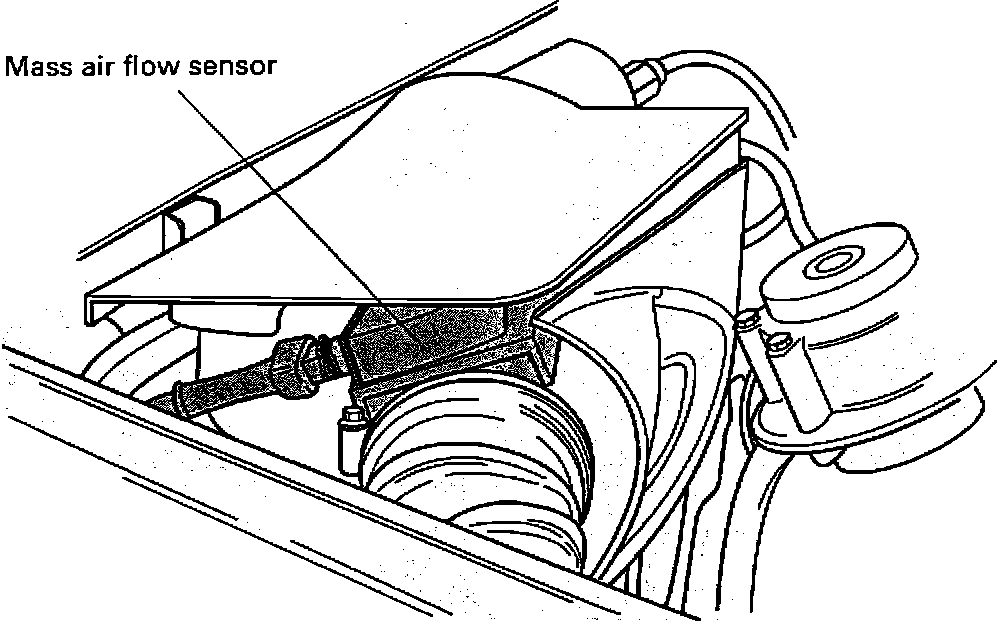 The Mass Air Flow Sensor is located in front of the turbocharger and is bolted to the air cleaner housing.