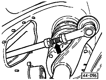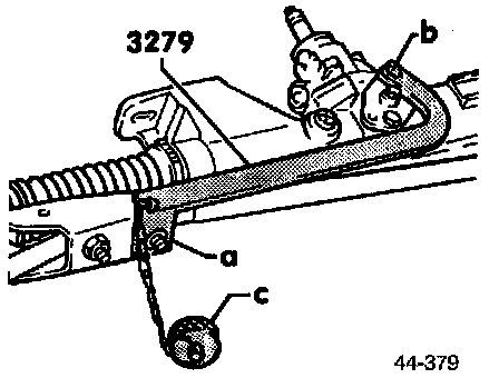 - Attach special tool 3279 with hole (a in illustration)over left mounting nut on tie rod carrier and tighten with knurled nut (c in illustration) on chain.