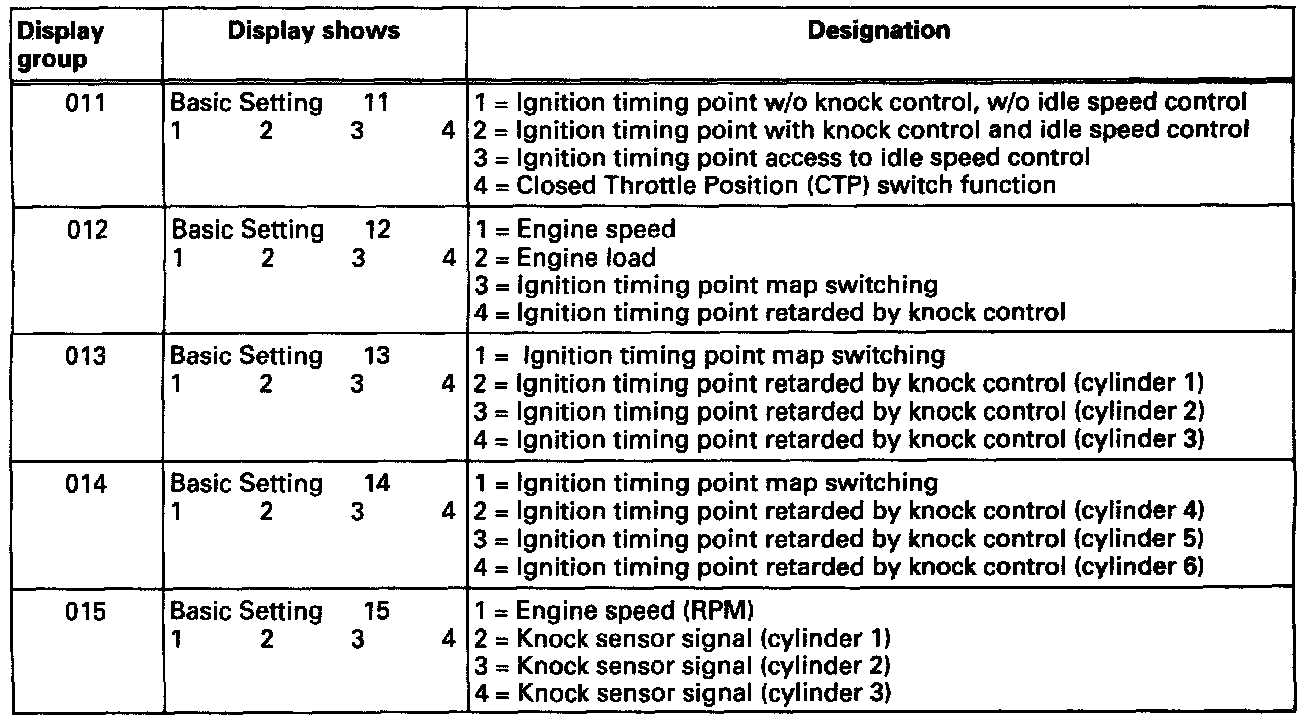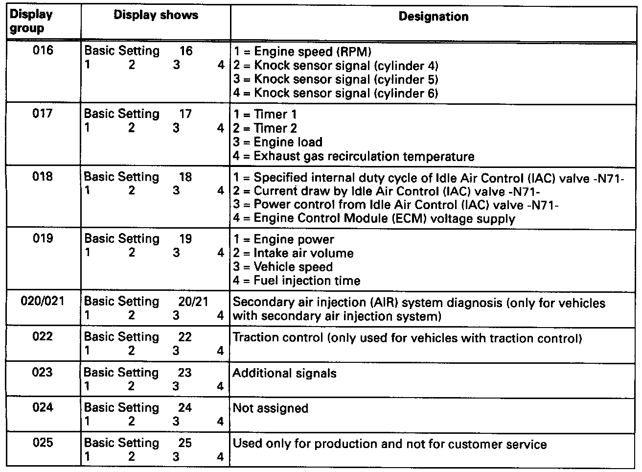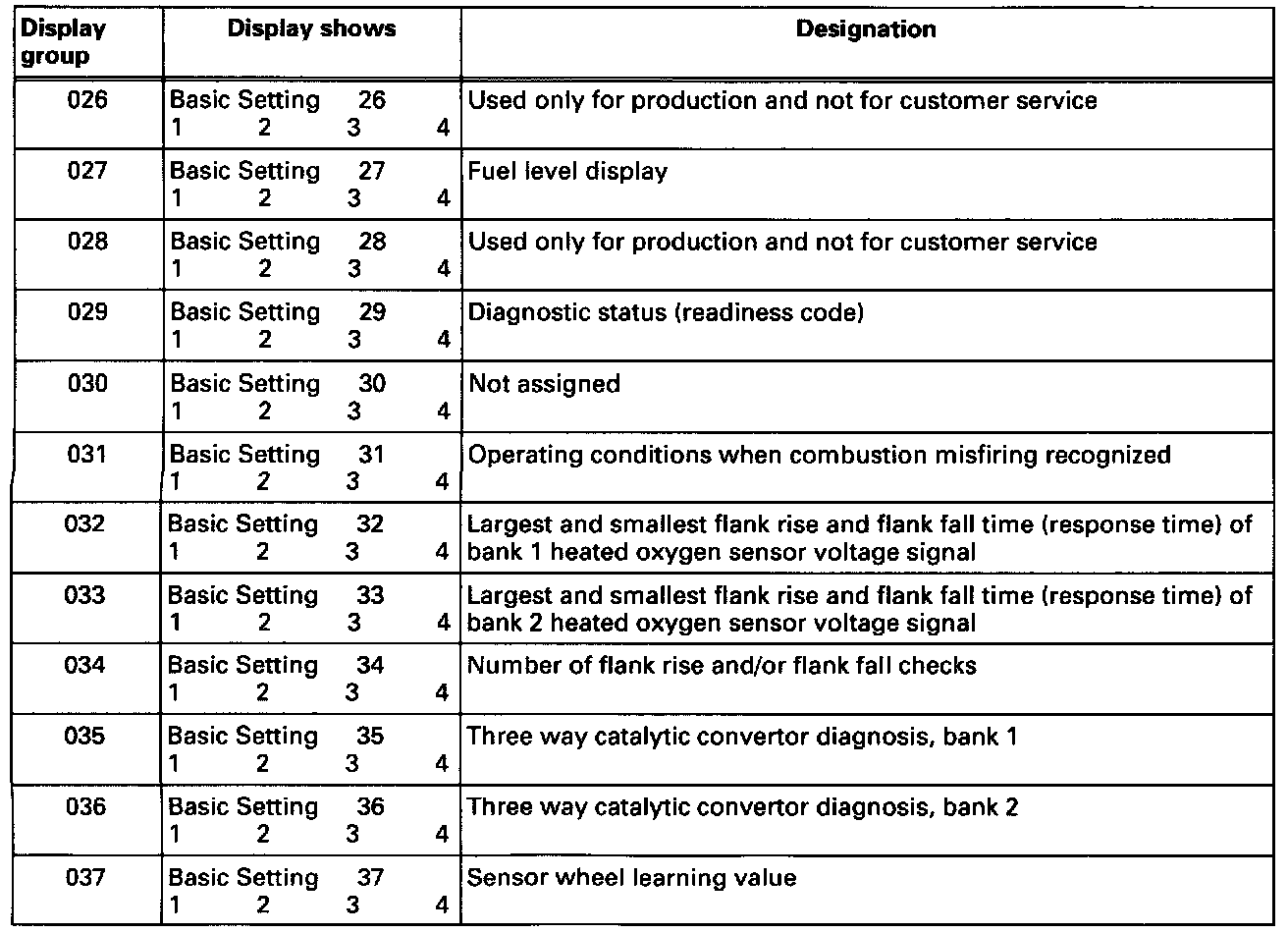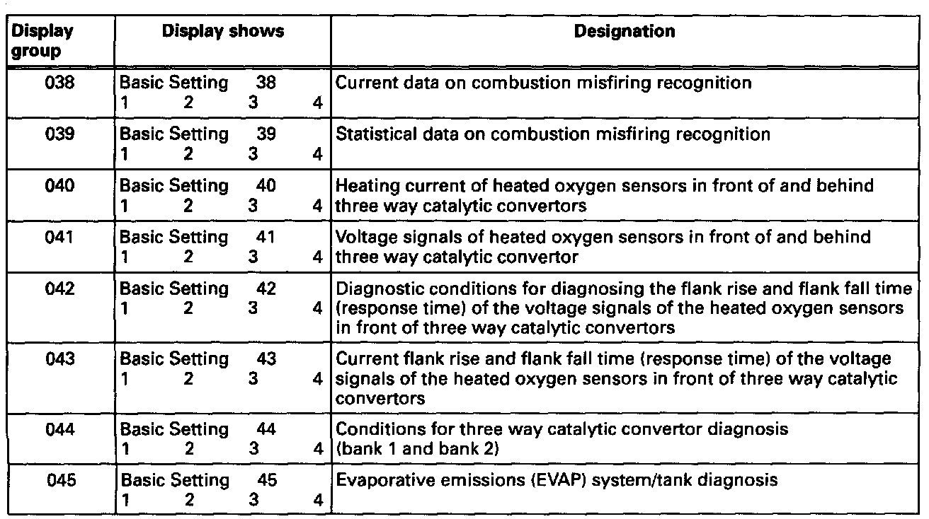 Display groups 11 to 45 are used for troubleshooting when there are driving performance problems, and used to evaluate components and systems that influence the exhaust.