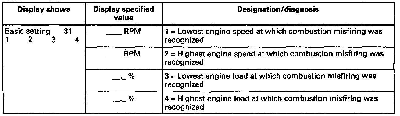 - Display group 031 shows the operating conditions that are present at the moment the malfunction is recognized. However the operating conditions are only displayed if combustion misfiring is recognized by the Engine Control Module (ECM) and stored in DTC memory. If there is more combustion misfiring that has to be displayed, the operating conditions of the most recently recognized combustion misfiring is displayed.