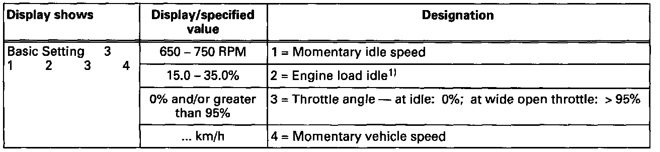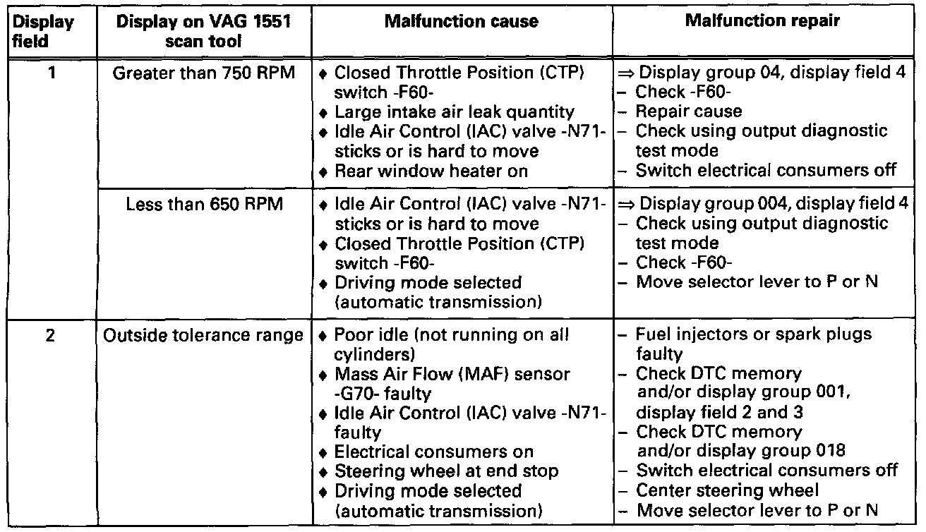Note on display field 1: Idle speed on vehicles without A/C and rear windshield heater switched on: 750-850 RPM.