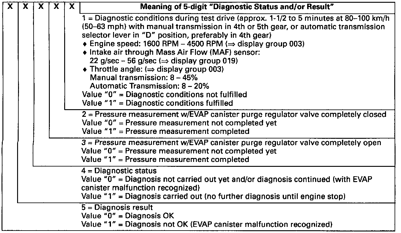 - The diagnostic conditions are only fulfilled during a drive of approx. 1-1/2 to 5 minutes at 80-100km/h (50-63 mph) with manual transmission in 4th or 5th gear, or automatic transmission selector lever in "D" position, preferably in 4th gear; If the diagnostic conditions are fulfilled, the diagnosis is active. To get the diagnosis results, you have to drive approx. 1-1/2 to 5 minutes under the diagnostic conditions, while the pressure has to be measured with closed EVAP canister purge regulator valve. First, the pressure must be measured with the valve closed. You can get the valve to close most easily by having a preceding deceleration fuel shut-off. If there are problems in shutting the EVAP canister purge regulator valve by deceleration fuel shut-off, it can also be shut by running display group 030 in "Basic Setting" function 04. Then the pressure has to be measured again in "Read Measuring Value Block" function 08 with valve fully open.