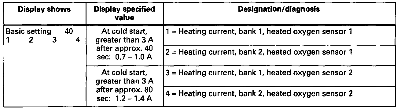 - The heating of the heated oxygen sensors behind the three way catalytic converter is not switched on immediately at engine start, but only when the calculated exhaust gas temperature in the three way catalytic converter exceeds 308°C (586°F) display group 044, display field 2. In order to reach an exhaust gas temperature of 308°C (586°F) in the three way catalytic converter after a cold start, the car must be driven about 20 sec. with an increased engine speed of 2500 RPM.