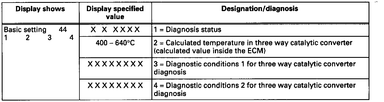 - If in display group 029, display field 1 the value of the three way catalytic converter diagnosis is not set to "0" during regeneration of the readiness code, and/or a malfunction is stored in DTC memory that affects the three way catalytic converter display group 044 can be used to selectively call the diagnostic conditions (display fields 3 and 4).