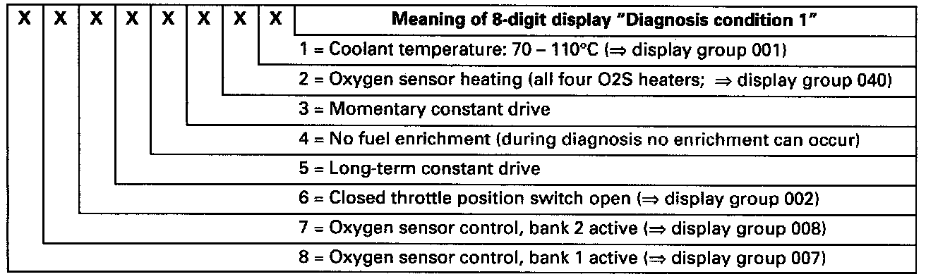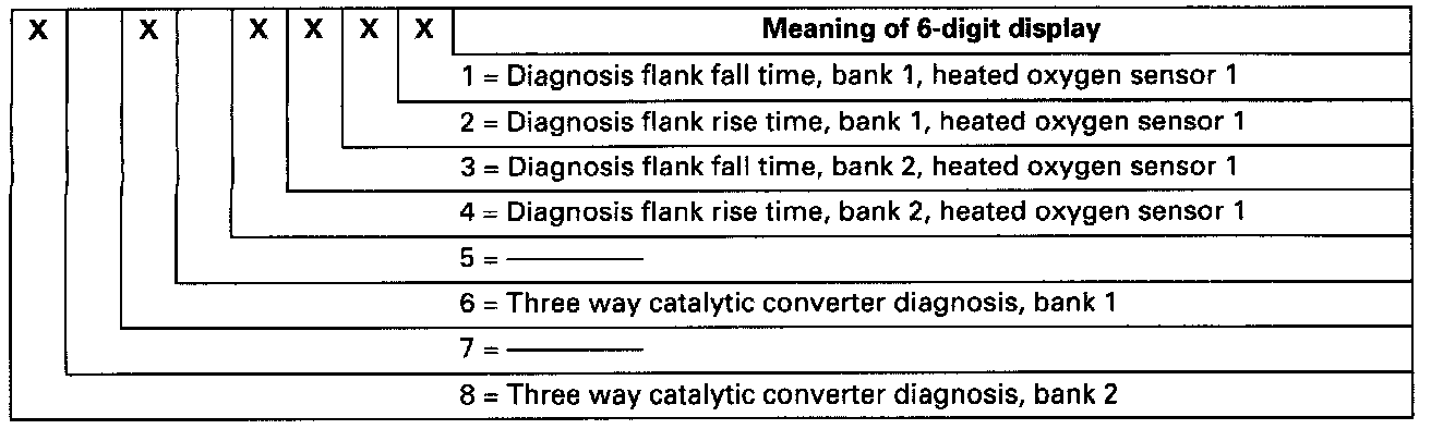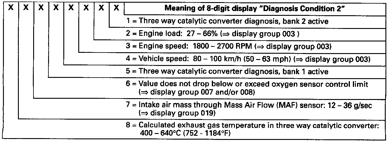 - When the diagnostic conditions are fulfilled (display fields 3 and 4) by using the heated oxygen sensors in front of and behind the three way catalytic converter at each start the Engine Control Module (ECM) carries out a diagnosis of the three way catalytic converter: During this diagnosis, the deterioration rate of the three way catalytic converter is determined. The deterioration rate of the three way catalytic converter is displayed when display groups 035 and 036 are displayed. However, this diagnosis is "cross-blocked." That means that before the three way catalytic converter diagnosis can be evaluated, a result of the heated oxygen sensor diagnosis must be available to the Engine Control Module (ECM).