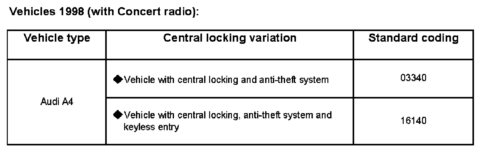 - Input coding of the central locking control module with keypad (e.g. 16140 for central locking with anti-theft/remote) vehicles 1998 >.