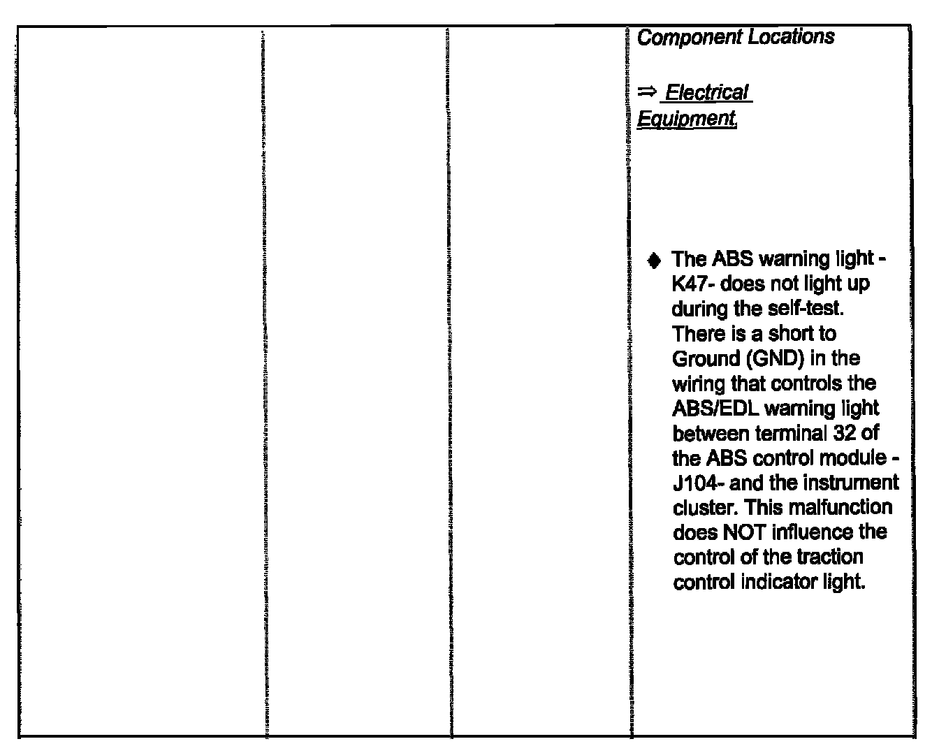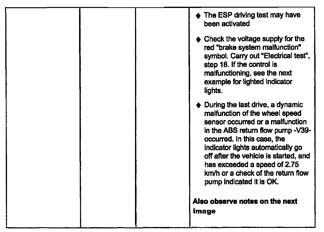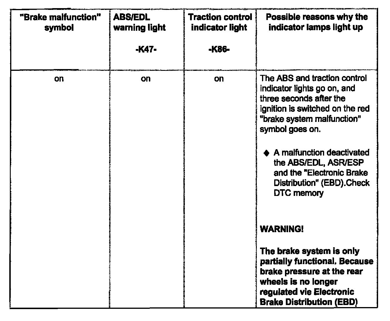 - If the ABS/EDL warning light -K47 and the red symbol for "Brake system malfunction" are not lit, but the brake system is not functioning properly, check for malfunctions in the mechanical/hydraulic brake system components.
