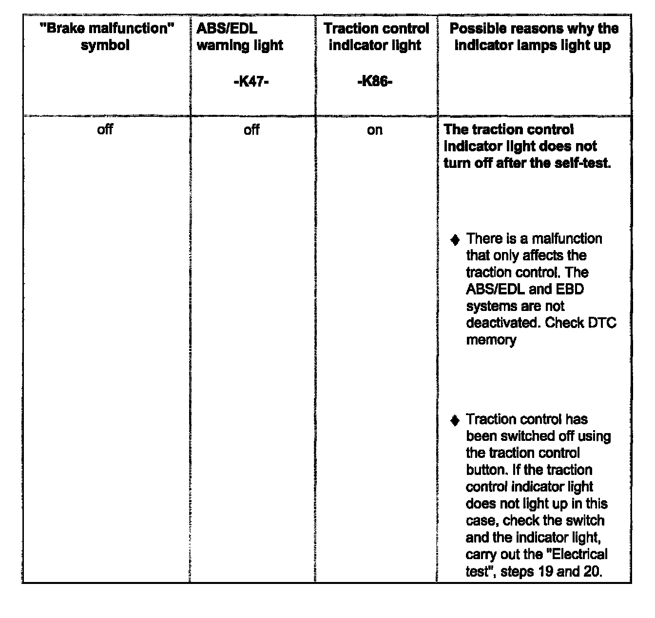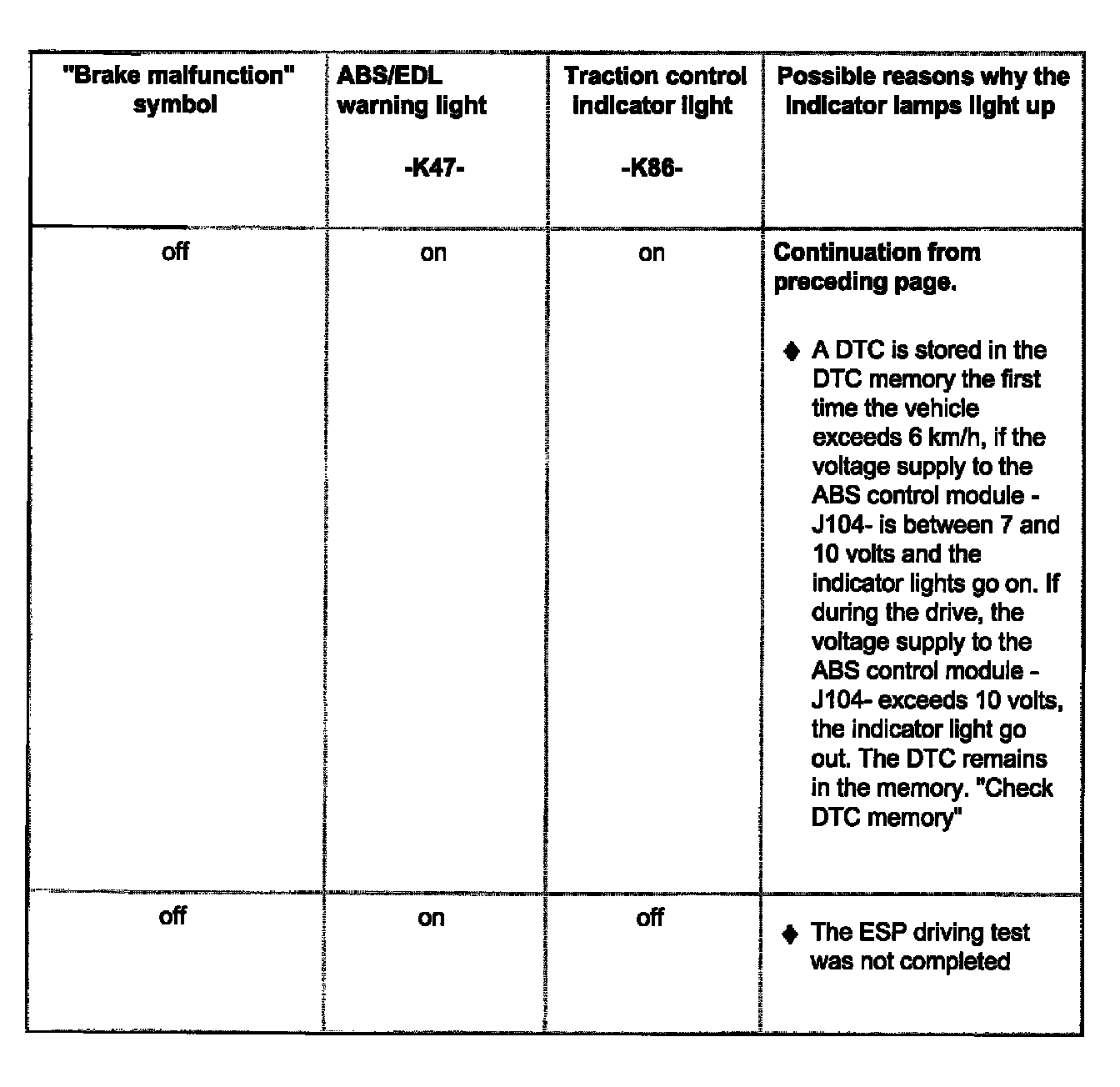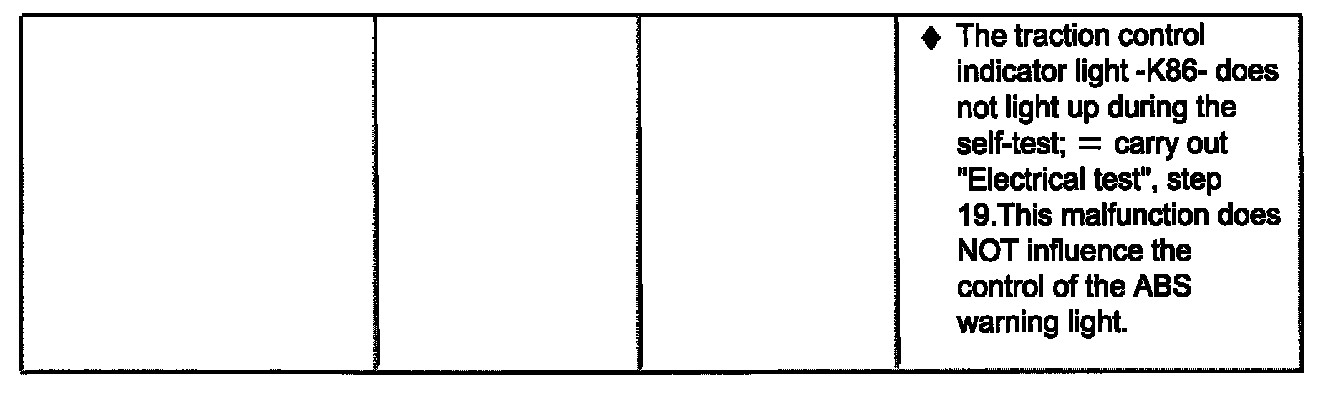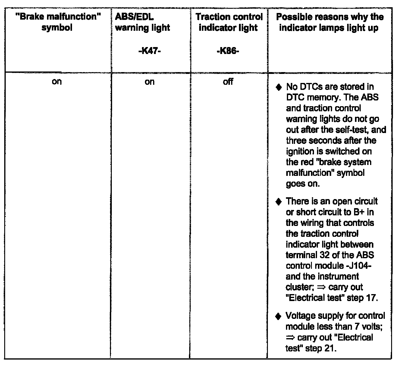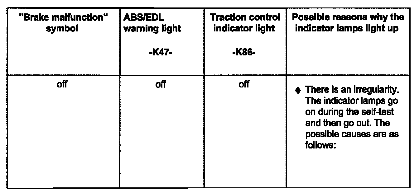 - The illustration shows the ABS/EDL warning light -K47- (right arrow), the warning light for brake system -K118(center arrow, red symbol for "brake system malfunction") and the traction control indicator light -K86- (left arrow).