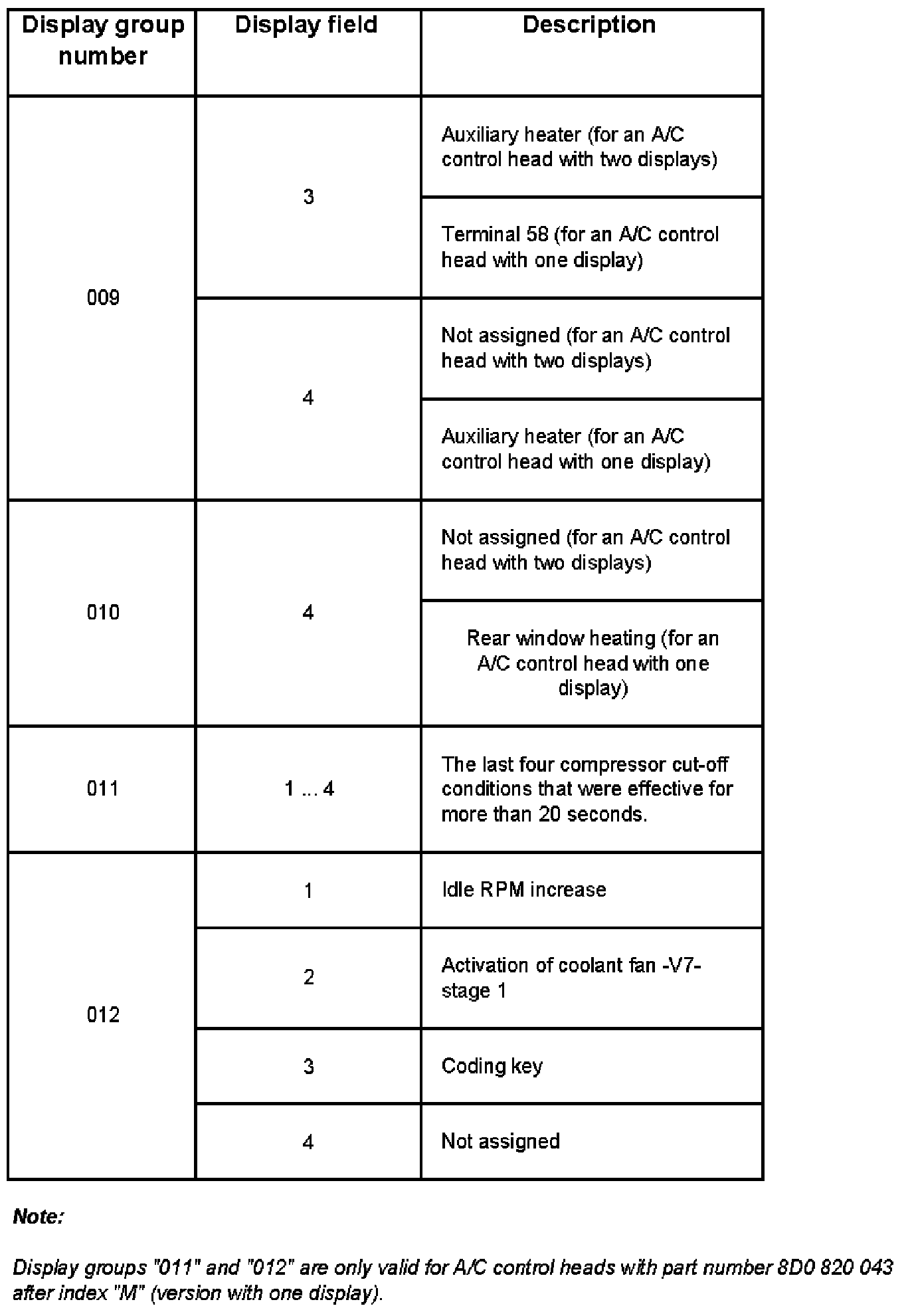 Display group number table, changes affecting m.y. 1998 On.