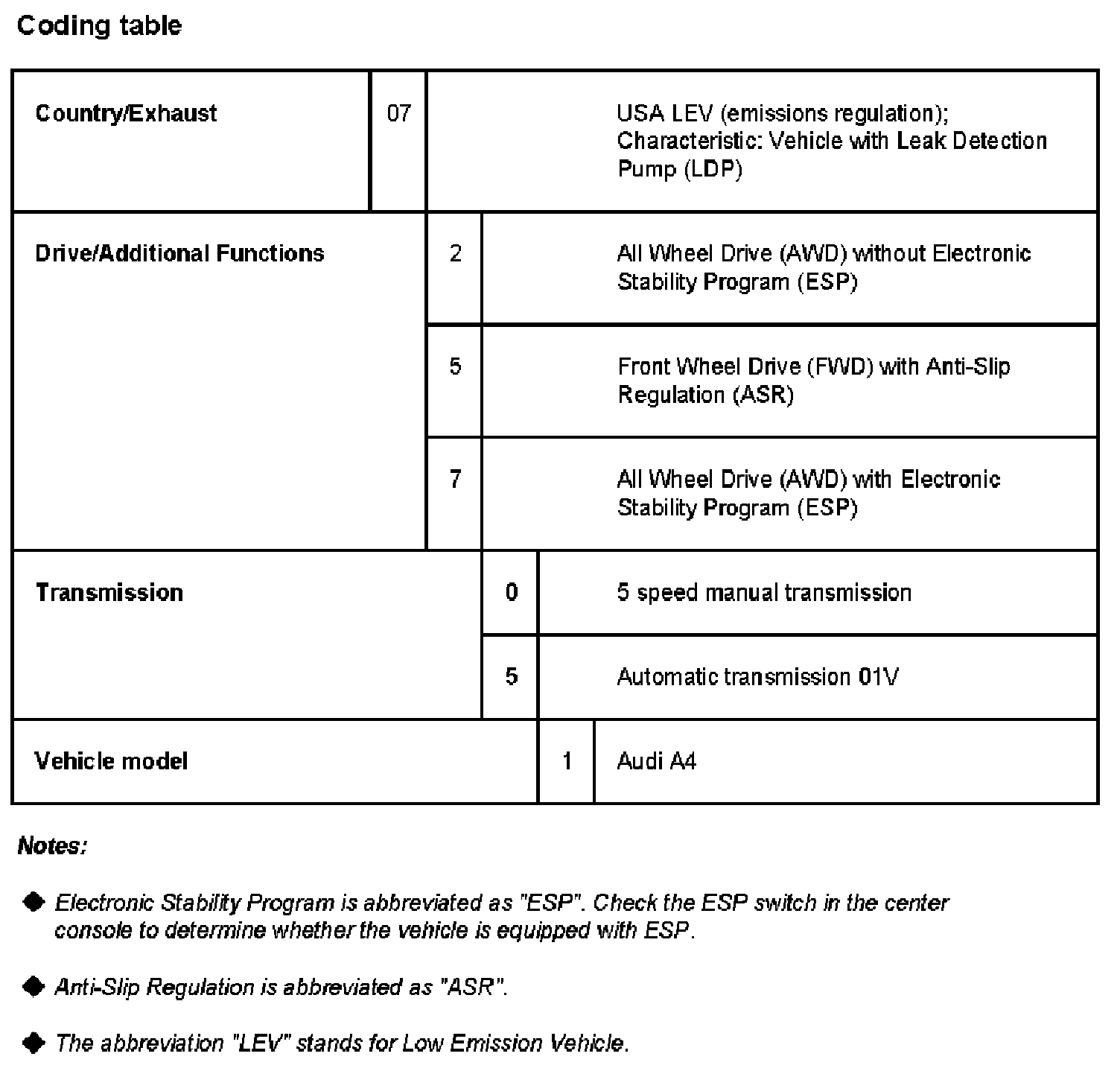 07251 USA LEV 1)(emissions regulations), All Wheel Drive (AWD) without ESP 2), 5 speed Automatic transmission, Audi A4