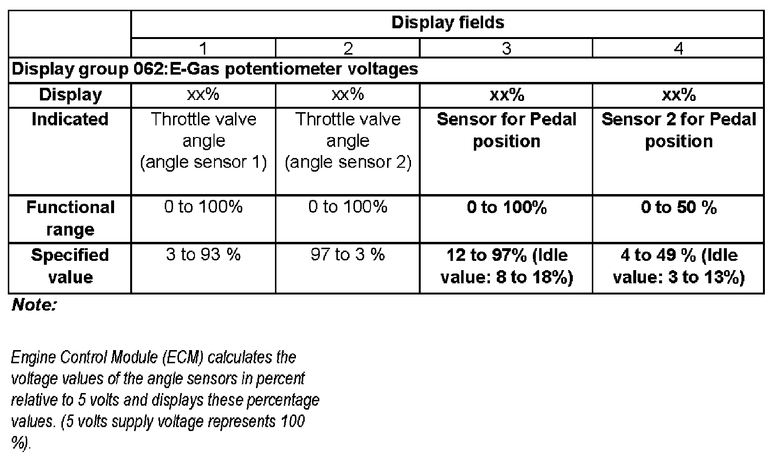 - Check specified values for E-gas potentiometer voltages in display fields 3 and 4.