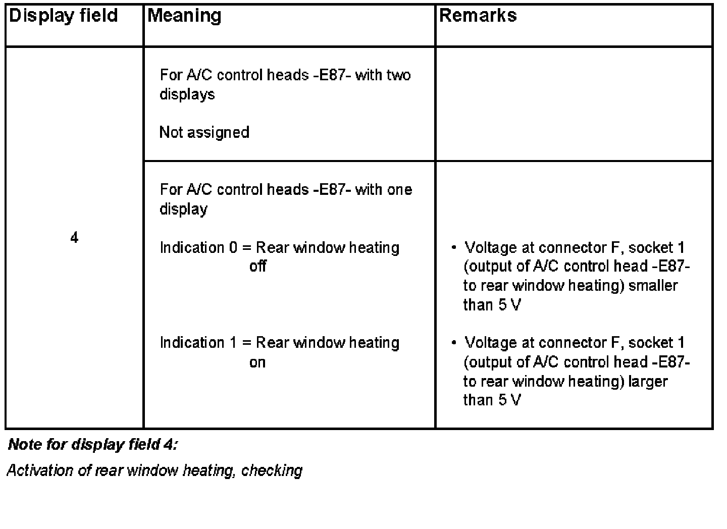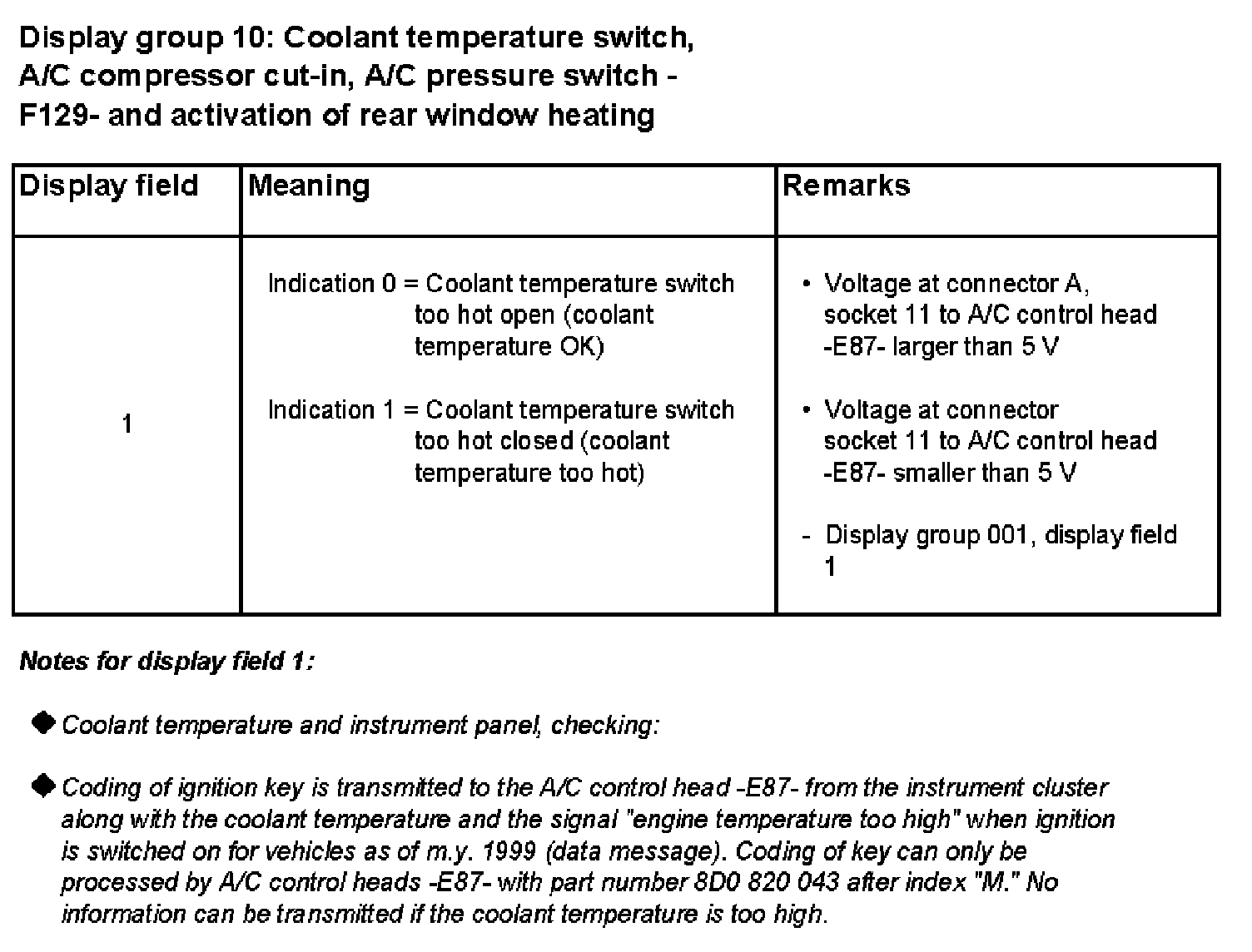 Display group 10: Coolant temperature switch, A/C compressor cut-in, A/C pressure switch -F129- and activation of rear window heating