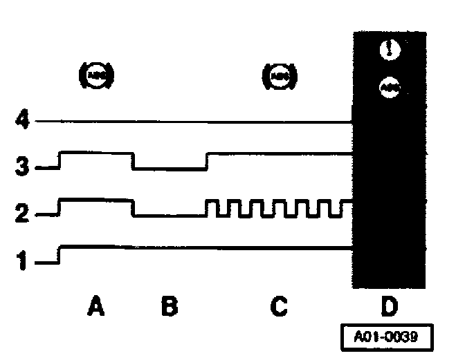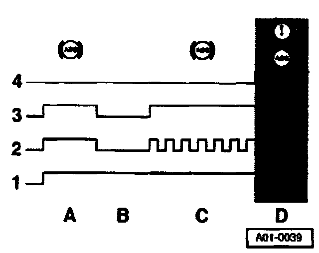 A - During phase "A" (after ignition is switched on) the ABS/EDL warning light is activated for two seconds during the self-test by means of signal "2", and comes on. During this phase an internal function in the instrument cluster suppresses the activation of the brake system warning symbol.