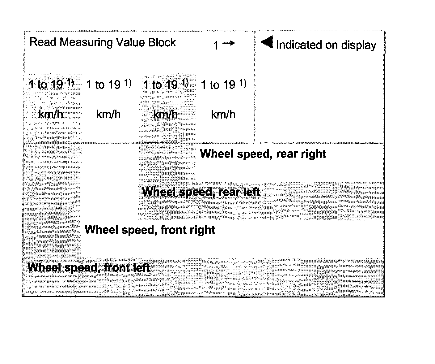 ^ Display zones 1 to 4 show the actual wheel speeds (at the tire circumference) in km/h. These are calculated by ABS control module (w/EDL) -J104- on the basis of the signals received from the wheel speed sensors. If one of the display zones shows no reading, proceed as for DTC's 00283, 00285, 00287, 00290 "Speed sensor", DTC table.