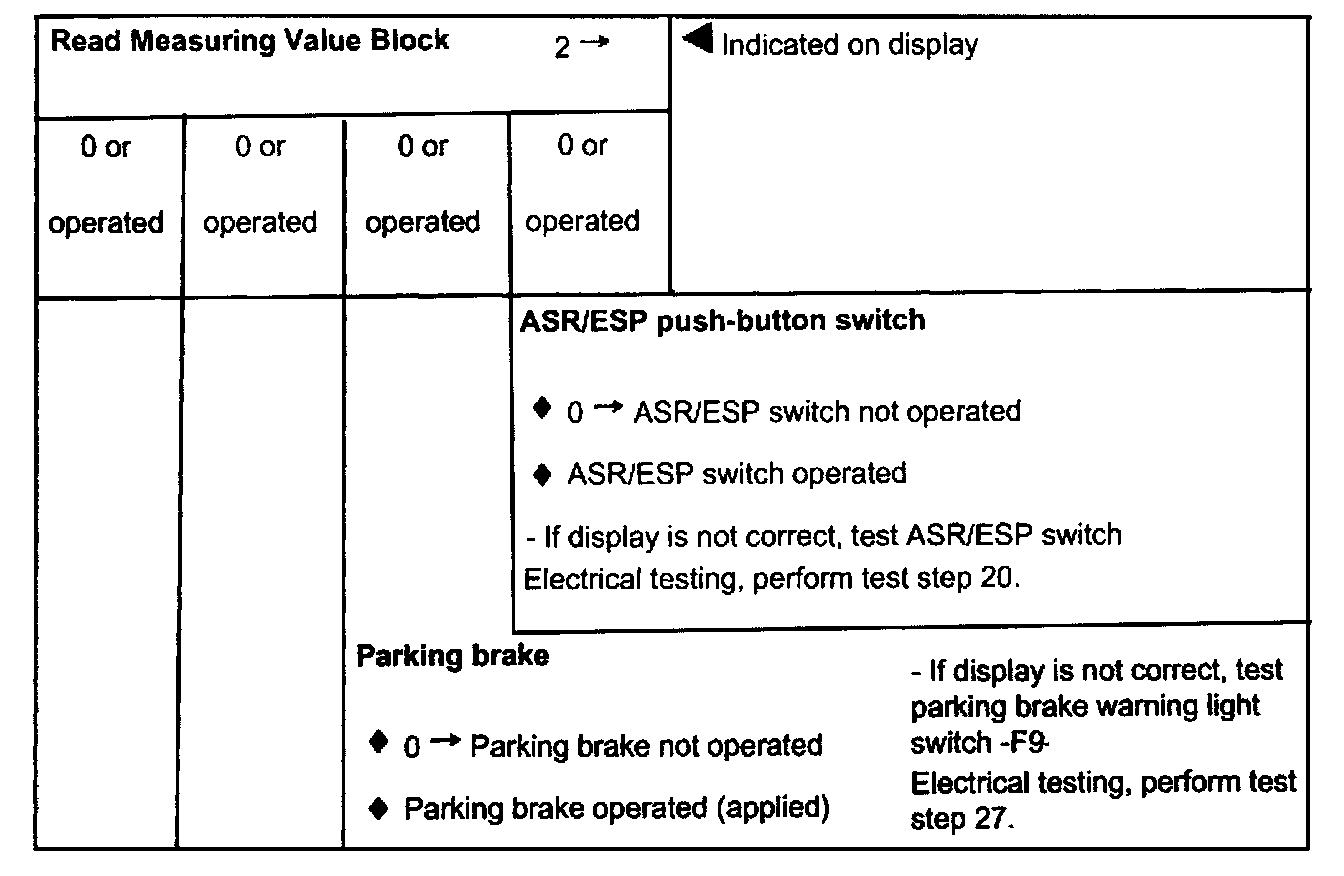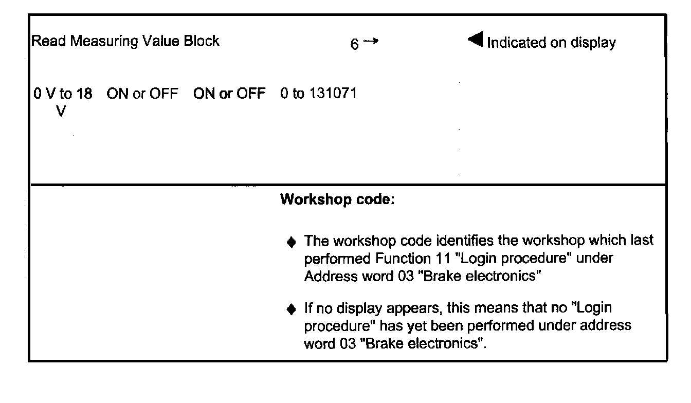 The control module can transfer test data (measured values) to VAS 5051 vehicle diagnostic, testing and information system or VAG 1551 scan tool. These measured values can provide information about the operational condition of the system and the sensors connected to it. In many cases the data supplied can be used to help trace and repair malfunctions The measured values provided by the ESP are grouped in six Display Groups, which can be called up via Display Group numbers.