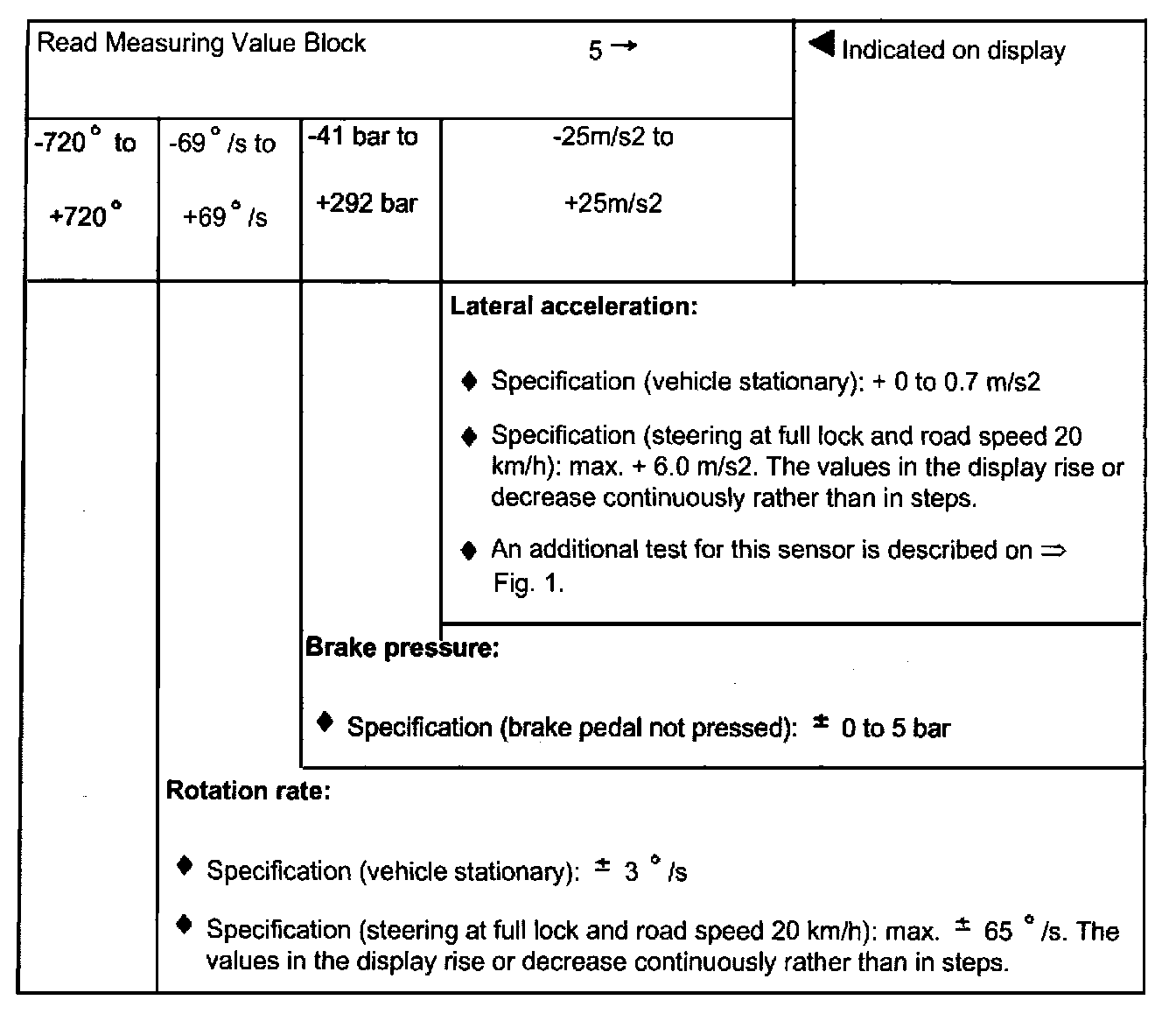 Note: Due to error in test card 8.0 for VAG 1551 scan tool and test card 5.0 for VAG 1552 scan tool, the value displayed in the measured value block (Display group 5, Display zone 4) is reduced by a factor of ten. In other words a lateral acceleration of 9.81 m/s2, for example, is indicated incorrectly as 0.98 m/s2.