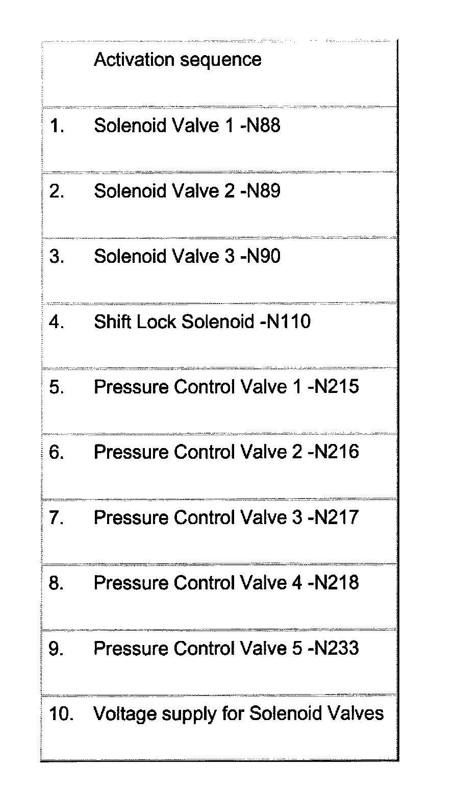 ^ The function of Solenoid Valve 1 -N88, Solenoid Valve 2 -N89 and Solenoid Valve 3 -N90 and Shift Lock Valve are checked acoustically during output DTM. During the acoustical check avoid noise close by as the shift noise (clicks) in the transmission are very quiet.