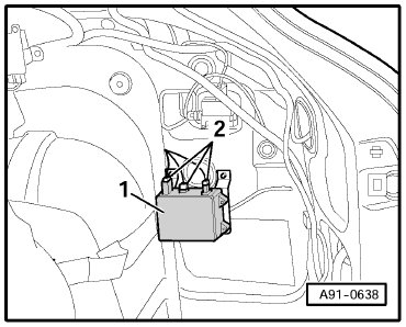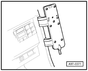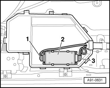 in electronics box, under front passenger's seat