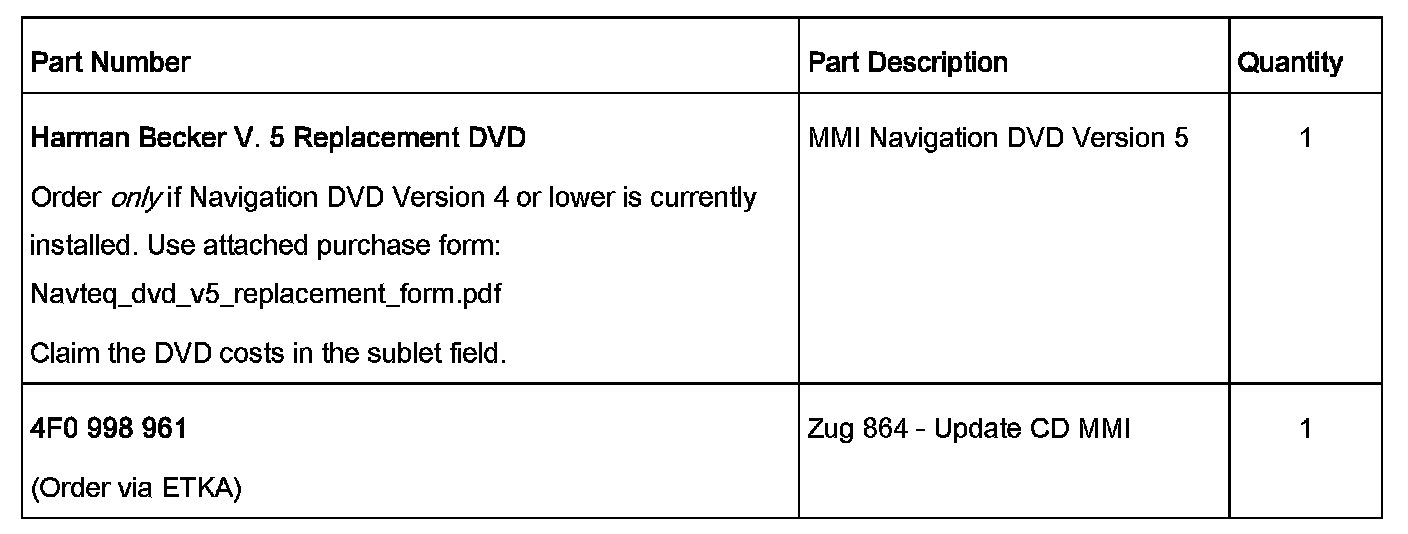 A6 and A8 prior to production date November 2004 may require an interim Zug update to Zug 317, as well as a Navigation DVD Update to Version 5. This is due to compatibility issues with the subsequent MMI Zug Update to Zug 864.