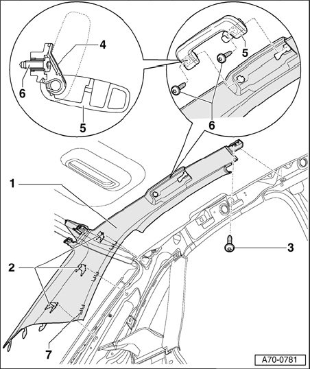 - Unclip three clips - 2 - at D-pillar trim - 1 -.