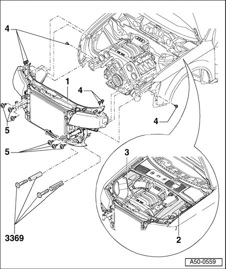 - Remove gasket for left and right front flap at juncture of fender at lock carrier - 1 -.