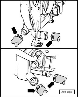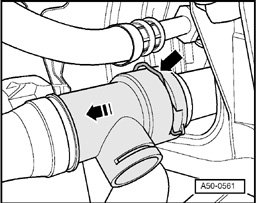 - On vehicles with charge air cooler, loosen bolts on hose clamps - arrows -.