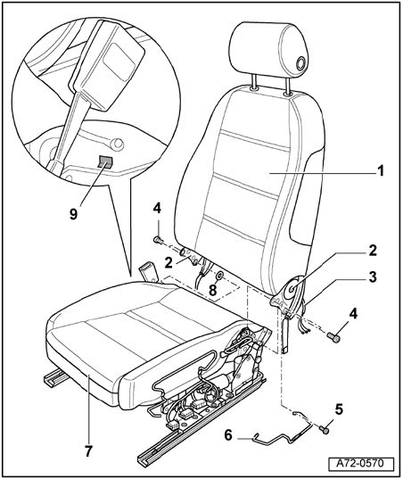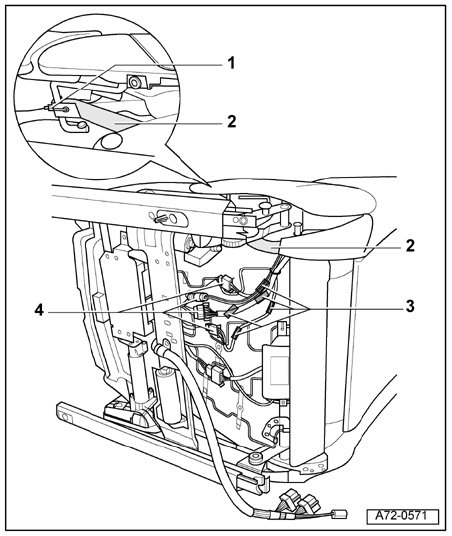- Push cushion aside and carefully disconnect wiring harness - 3 - from seat pan - 7 -.
