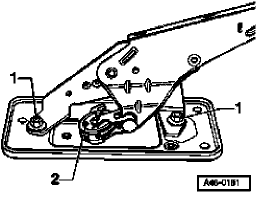 - Press the release button, Item -2- (both snap hooks should catch the parking brake cable eyelets).