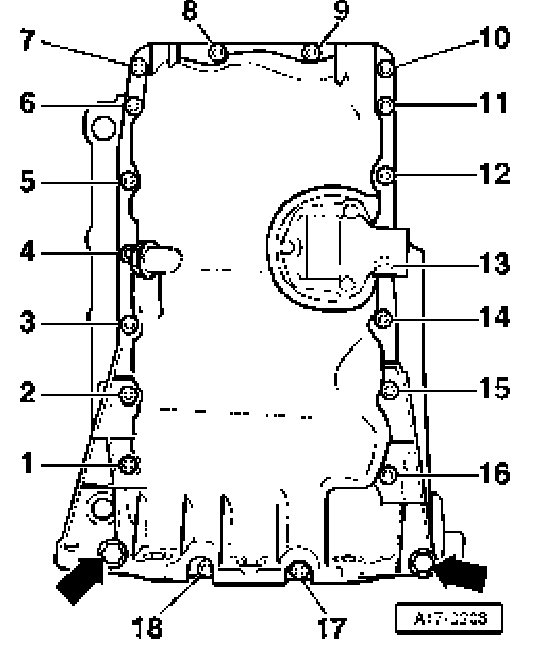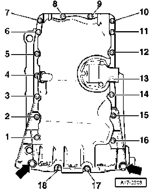 ^ Install oil pan immediately and tighten bolts in sequence shown: