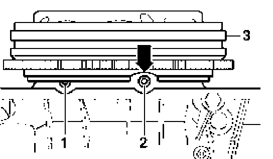 Note: Remove both rear oil pan bolts -1- and -2- using socket attachment 3249 or T10058. On vehicles with manual transmission, do this by turning flywheel -3- until recess -arrow- is aligned with bolt.